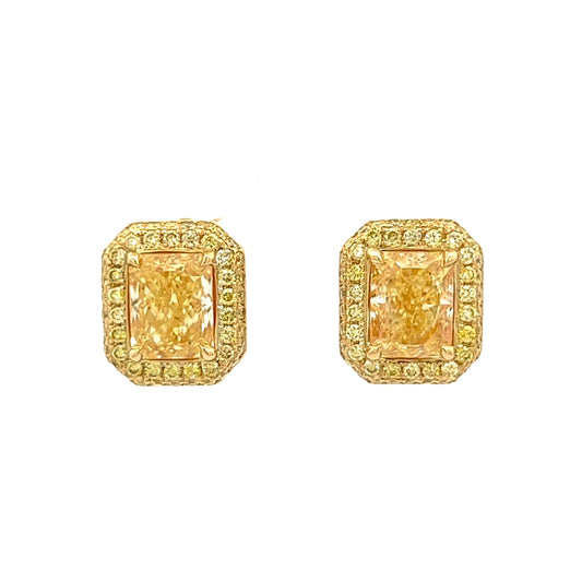 3.35 Cts. Fancy Yellow Cushion Halo Stud Earrings