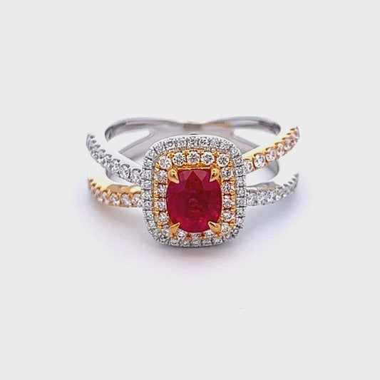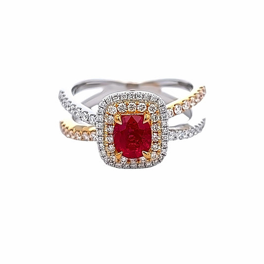 Anillo de doble banda de diamantes y rubíes de forma ovalada de dos tonos 0,84