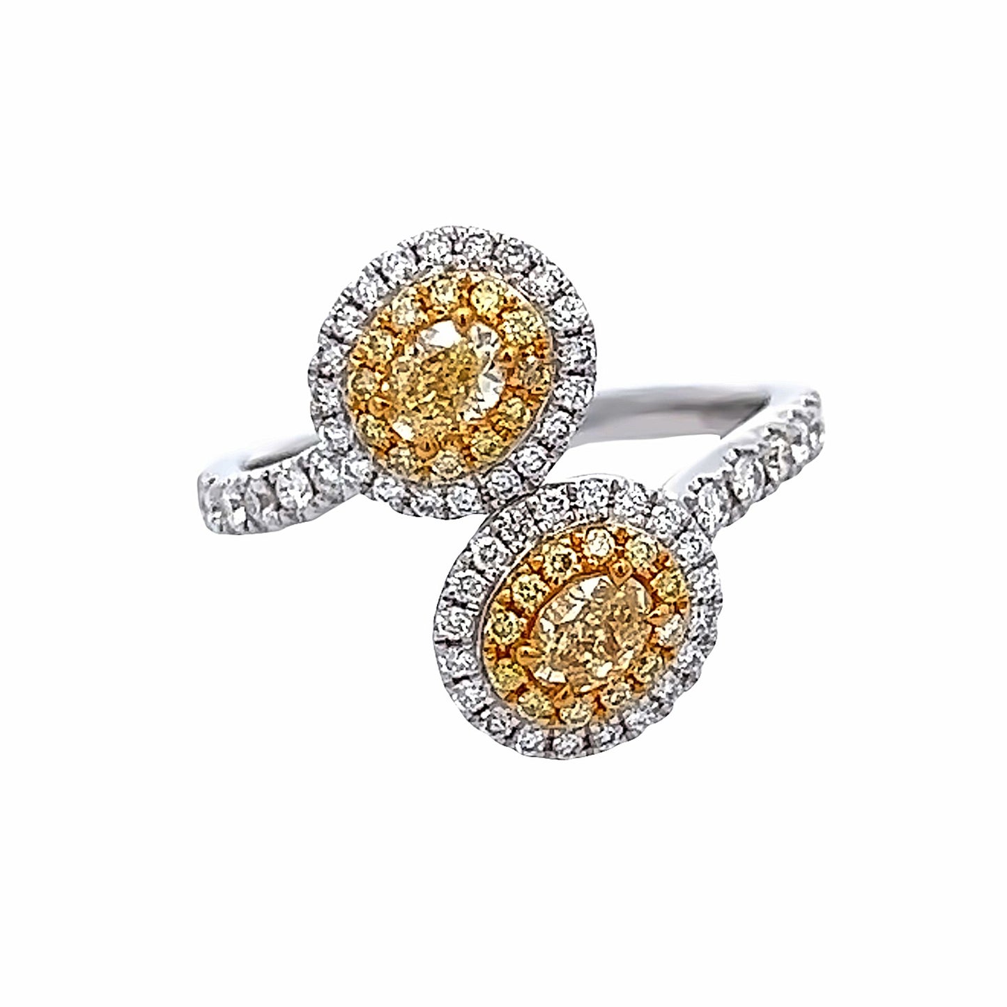 Anillo de talla ovalada con diamantes naturales amarillos y blancos de doble fantasía de 0,80 quilates