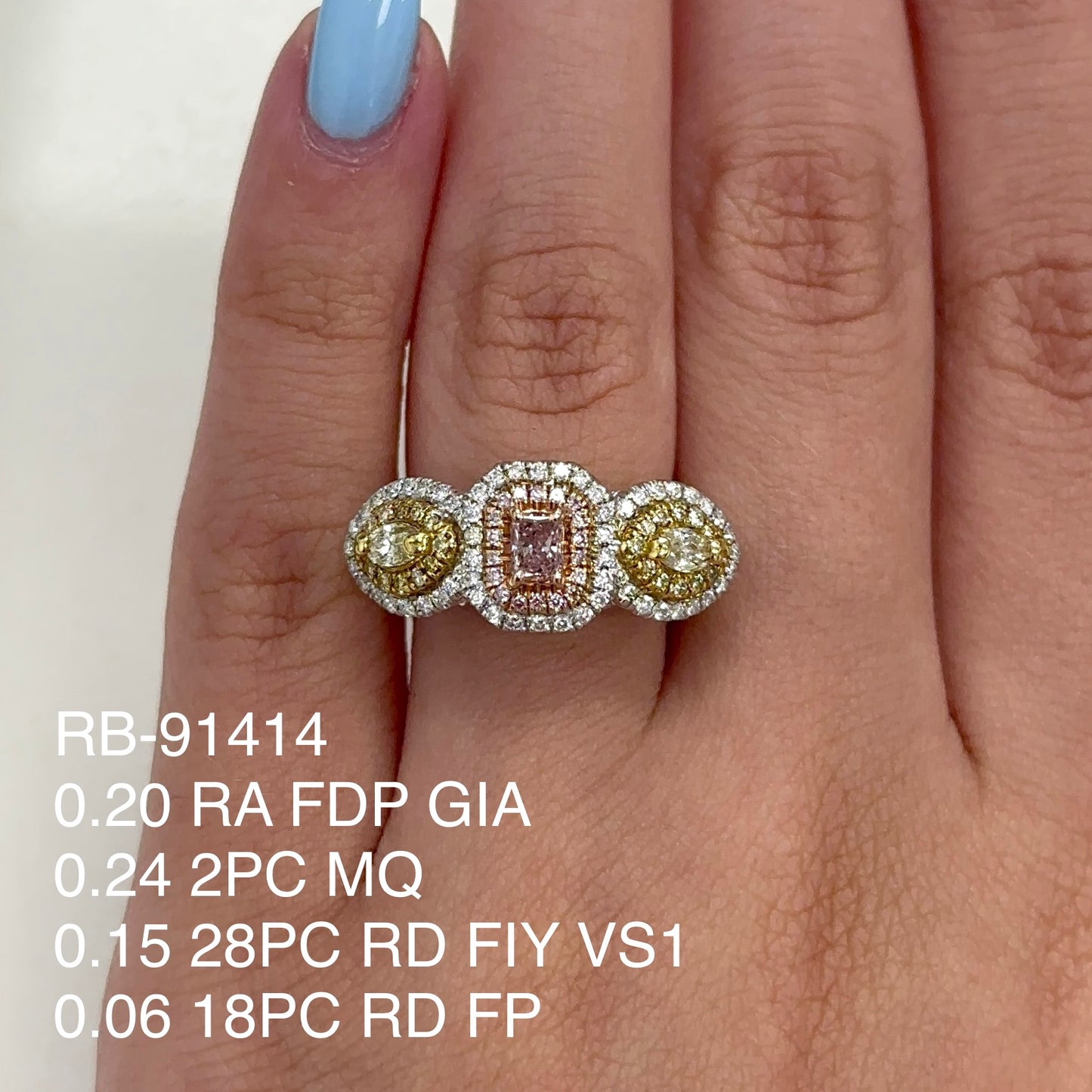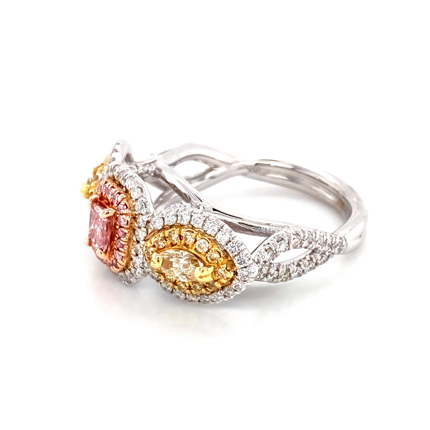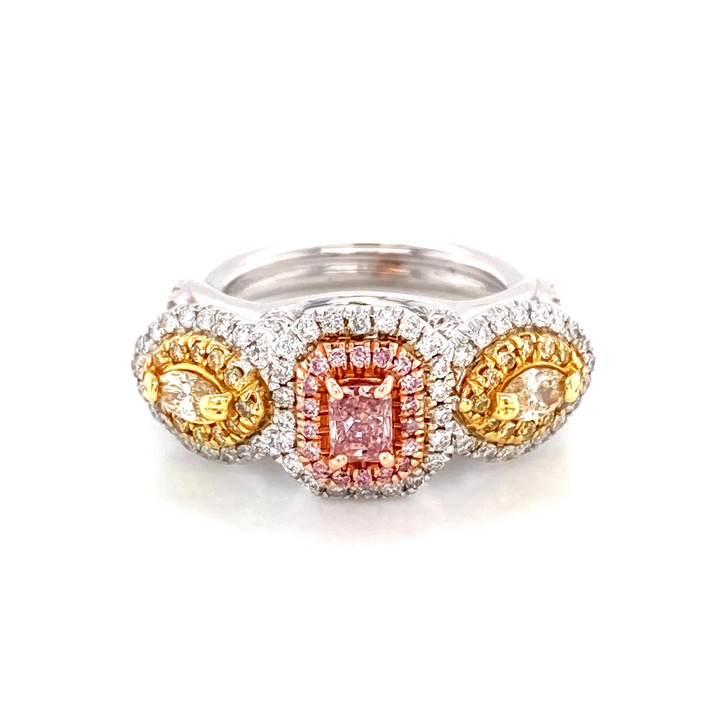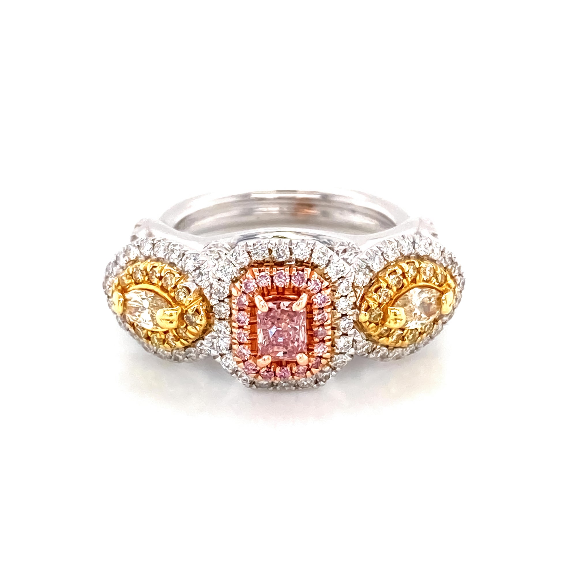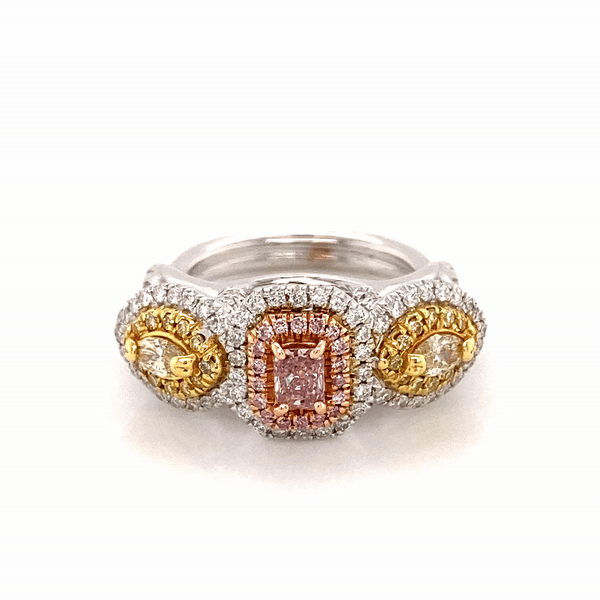 Experimente el encanto del lujo con nuestro anillo de diamantes amarillo y rosa intenso Tricolor Natural Fancy de 1,22 quilates. Elaborada con detalles exquisitos, esta impresionante pieza cuenta con un diseño tricolor que muestra la belleza de los diamantes rosas y amarillos naturales. Eleva tu estilo con este exclusivo y elegante anillo.