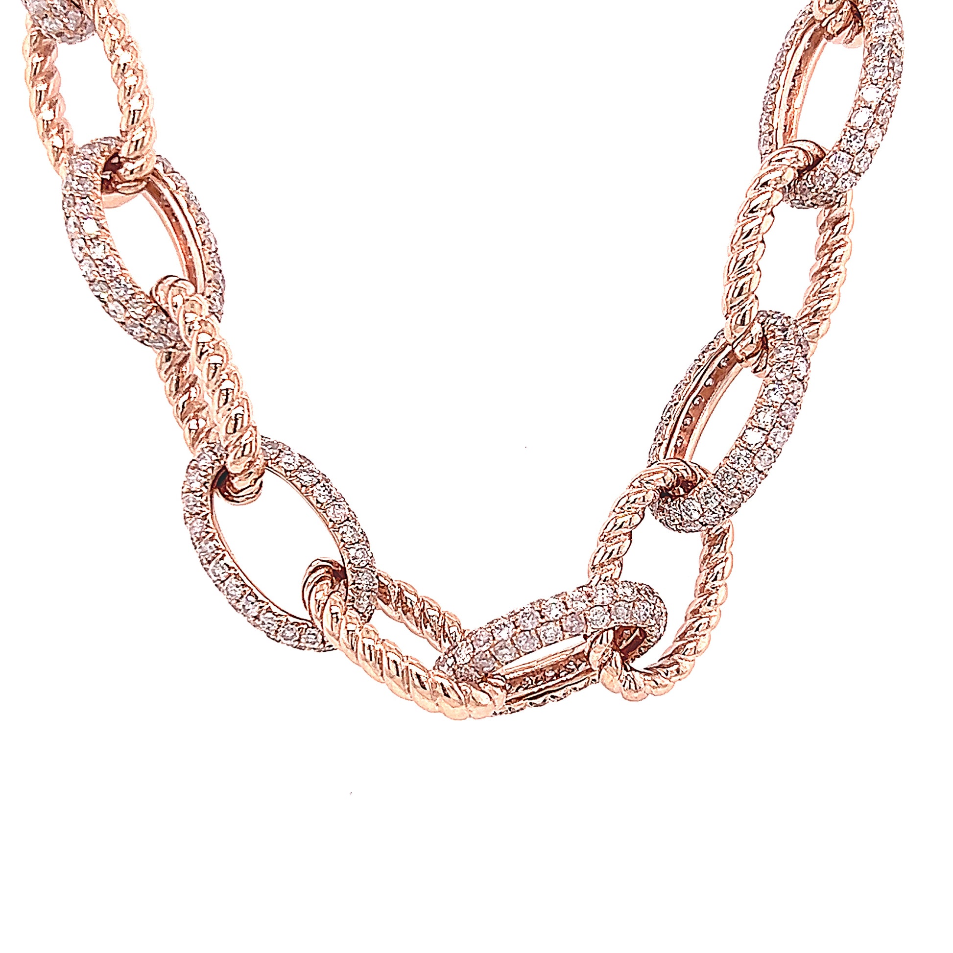 Este elegante collar Rg de 18k presenta eslabones oblongos forrados con 13.11 Rd Tcw de diamantes, creando una apariencia moderna perfecta para cualquier ocasión. Elaborado con ojo experto en los detalles, este collar brillará durante muchos años.