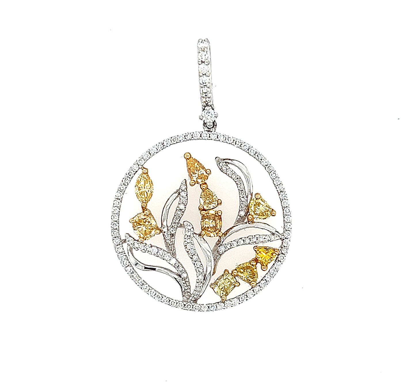 Este colgante circular es perfecto para agregar un toque de clase a cualquier colección de joyería, ya que presenta un hermoso y exclusivo diseño floral elaborado en oro blanco de 18 k y 1,41 quilates de diamantes de talla redonda de primera calidad. Con un peso total de 1,41 quilates de diamantes, este colgante circular de flores es una adición impresionante a cualquier conjunto.