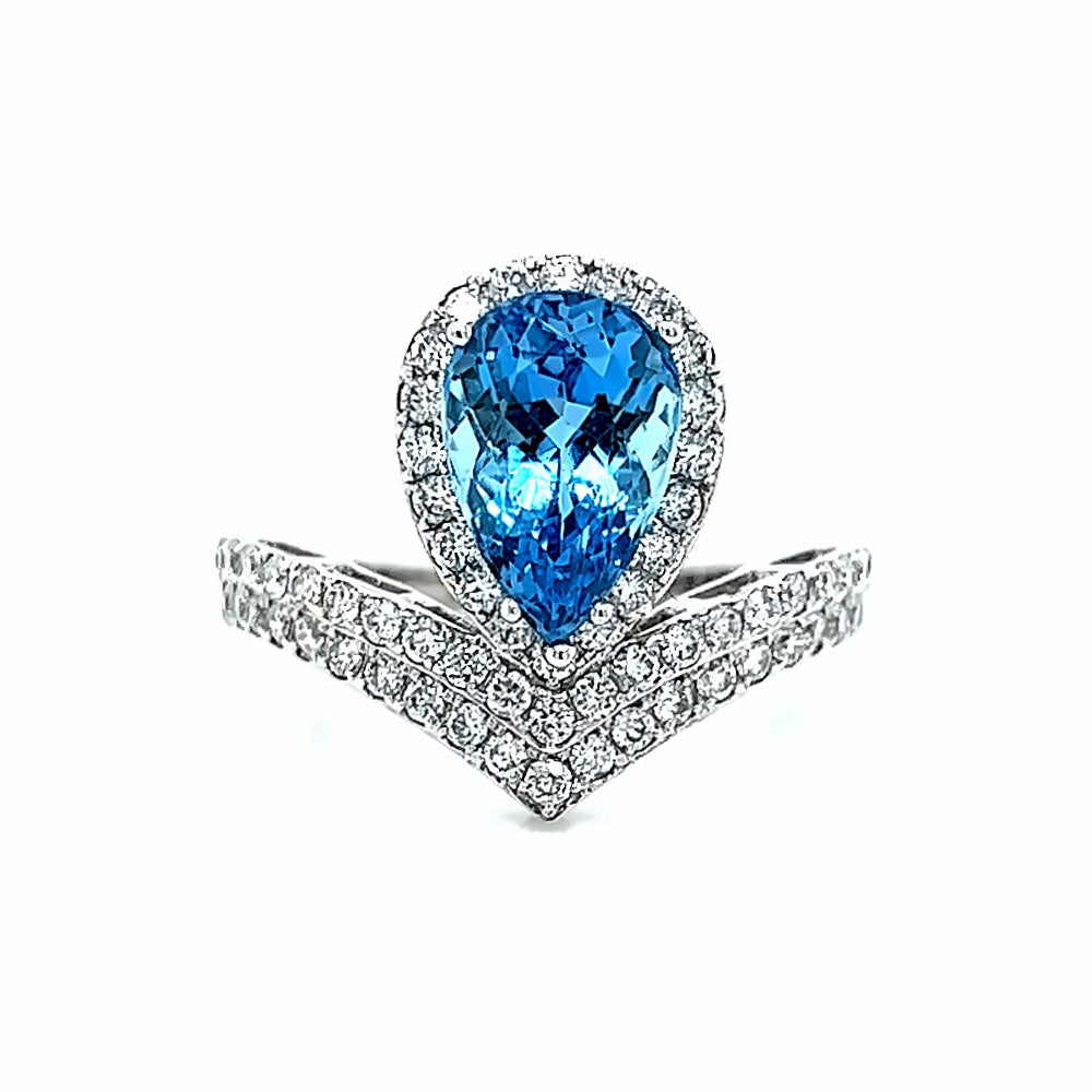 Este impresionante anillo de diamantes en oro blanco de 18k presenta una impresionante piedra central de aguamarina en forma de pera de 2,03 quilates. Elaborada por joyeros expertos, esta preciosa pieza es una exquisita adición a cualquier colección de joyas.