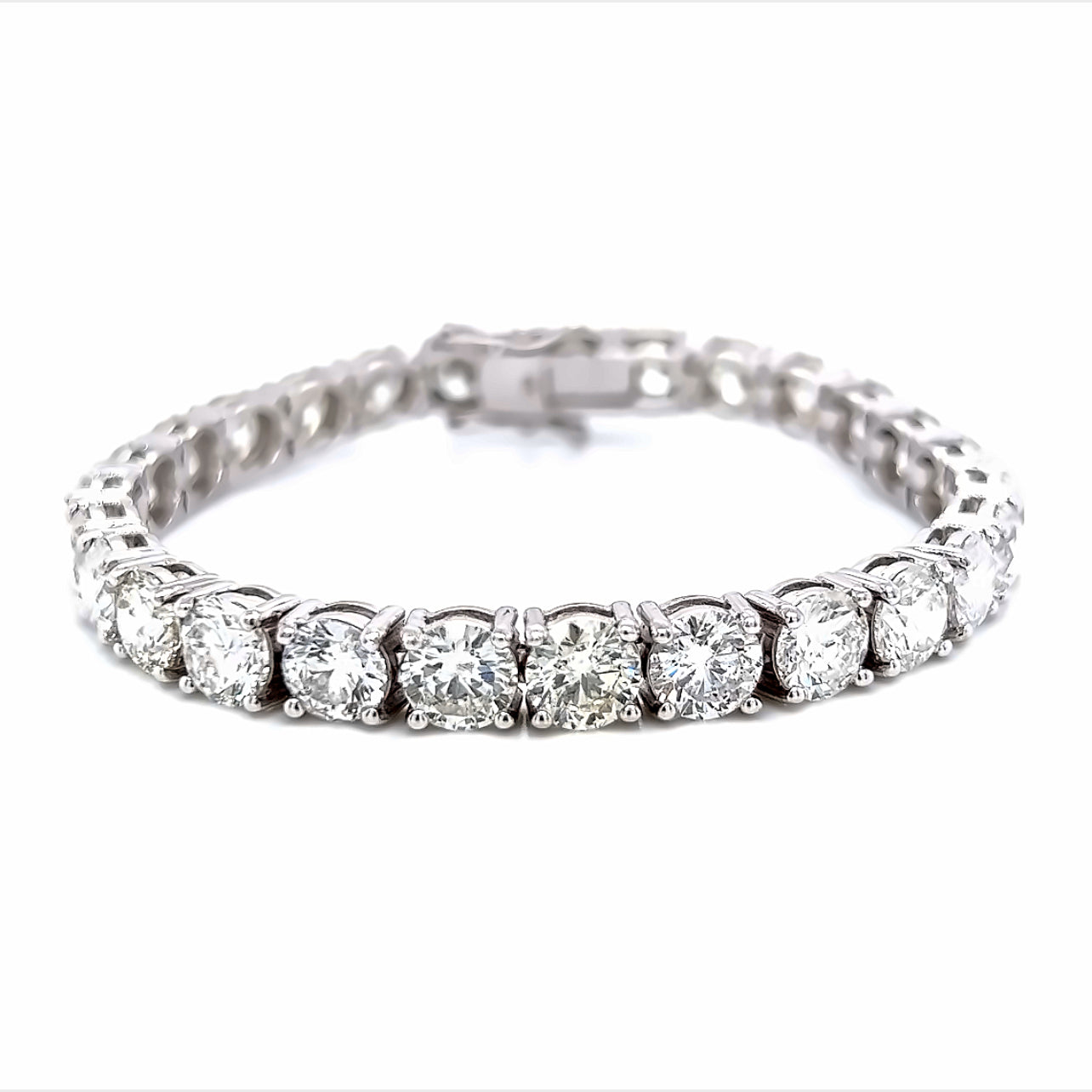 Esta pulsera de oro blanco de 18k irradia elegancia. Con 28,32 quilates de diamantes de talla redonda de mayor claridad, este brazalete de tenis seguramente llamará la atención. Con su cierre seguro tipo caja, puede estar seguro de que se ajustará cómodamente.