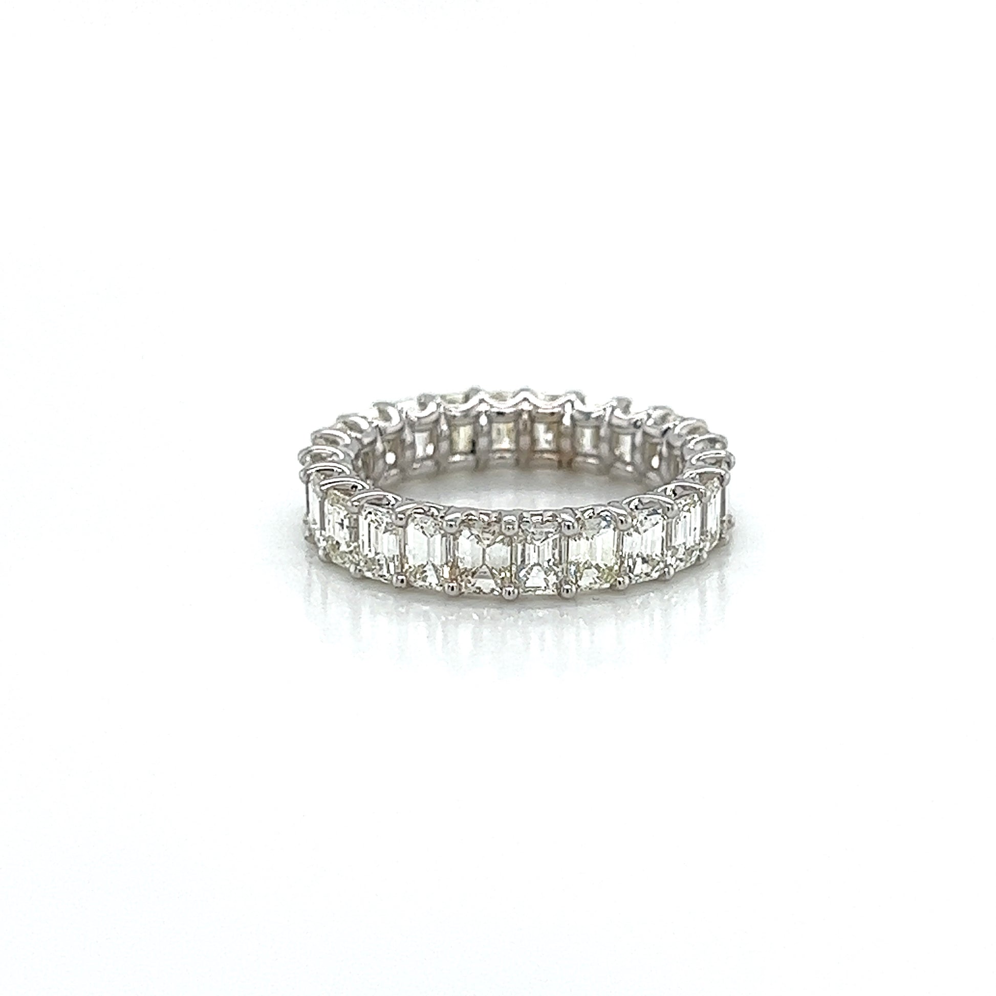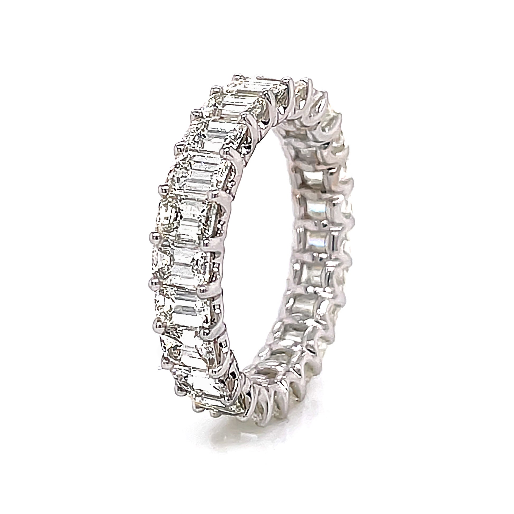 Este anillo de eternidad de oro blanco de 18 quilates irradia sofisticación y elegancia atemporales. Con diamantes de talla esmeralda de 4,14 quilates, esta pieza seguramente se convertirá en una reliquia familiar. Perfecto para simbolizar tu amor eterno.