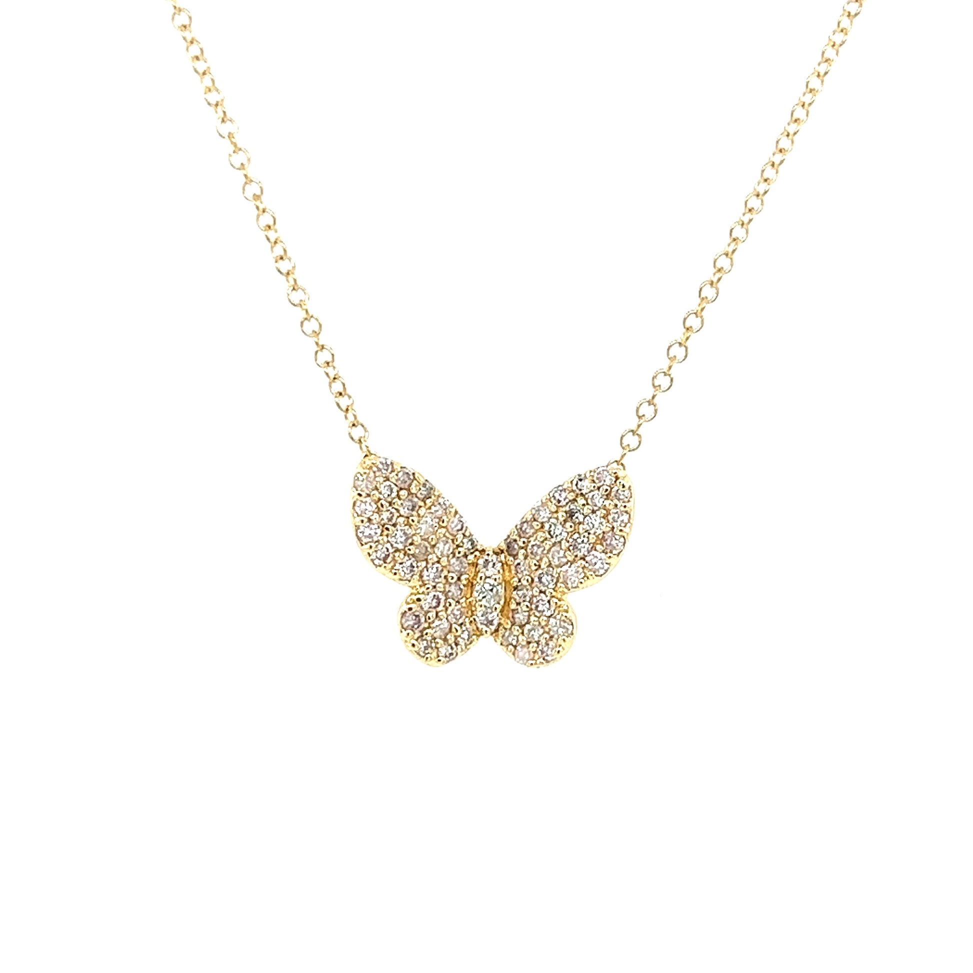 Este collar de mariposa de oro amarillo de 18k tiene incrustaciones de diamantes redondos de 0,40 quilates de peso total para brindar brillo y brillo. Su elegante diseño seguramente traerá alegría y hará una hermosa declaración.
