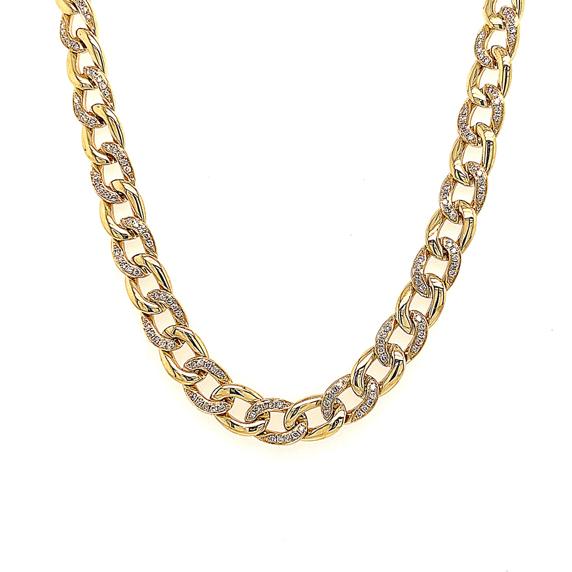 Este exquisito collar de oro amarillo de 18 quilates presenta una deslumbrante cadena de eslabones con 1,77 quilates de diamantes redondos de talla brillante. Los diamantes tallados con precisión cuentan con un impresionante peso total en quilates de 1,77 y seguramente iluminarán cualquier conjunto.