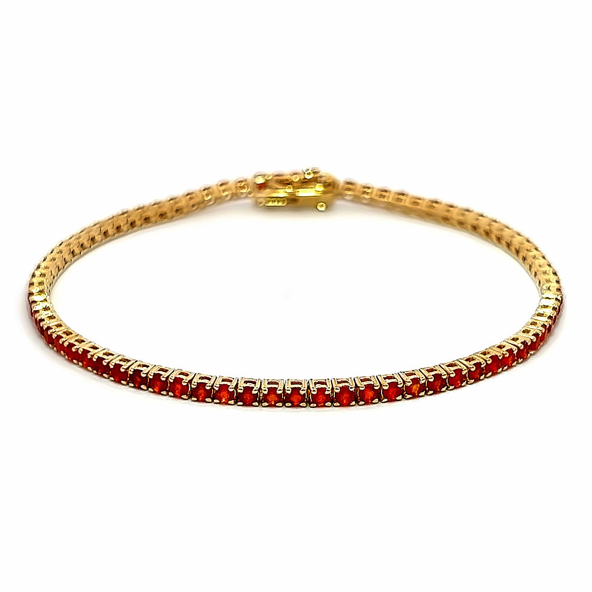 Indulge in luxury and elevate your style with our 2.30 Orange & Red Onyx Tennis Bracelet. The vibrant orange and red onyx stones bring a pop of color to any outfit, while the elegant tennis design exudes sophistication. Enhance your ensemble with this exquisite piece, perfect for any occasion.