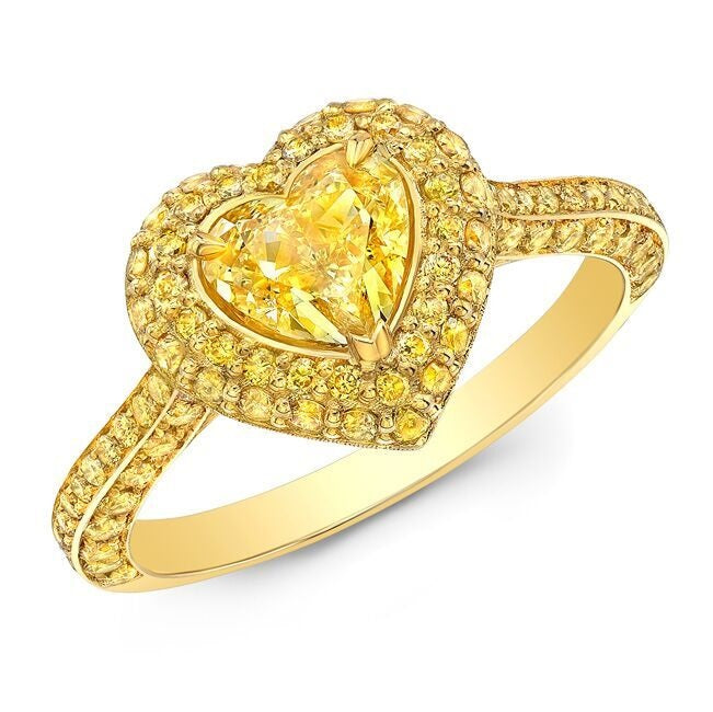 Experience true luxury with our exclusive 1.92 TCW Heart Shape Natural Fancy Intense Yellow Diamond Ring. Crafted with a stunning heart-shaped diamond, this ring radiates sophistication and elegance. Let it be a symbol of your love or treat yourself to its timeless beauty.