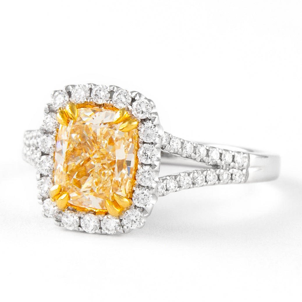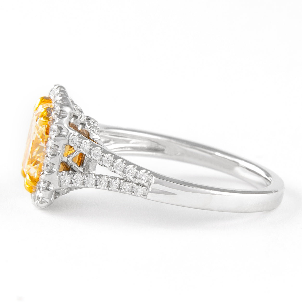 Featuring an 18k white gold 2.01 carat radiant fancy intense yellow diamond, this stunning halo ring is perfect for a special occasion. Crafted with quality craftsmanship and an eye-catching yellow stone, this piece is sure to be adored.