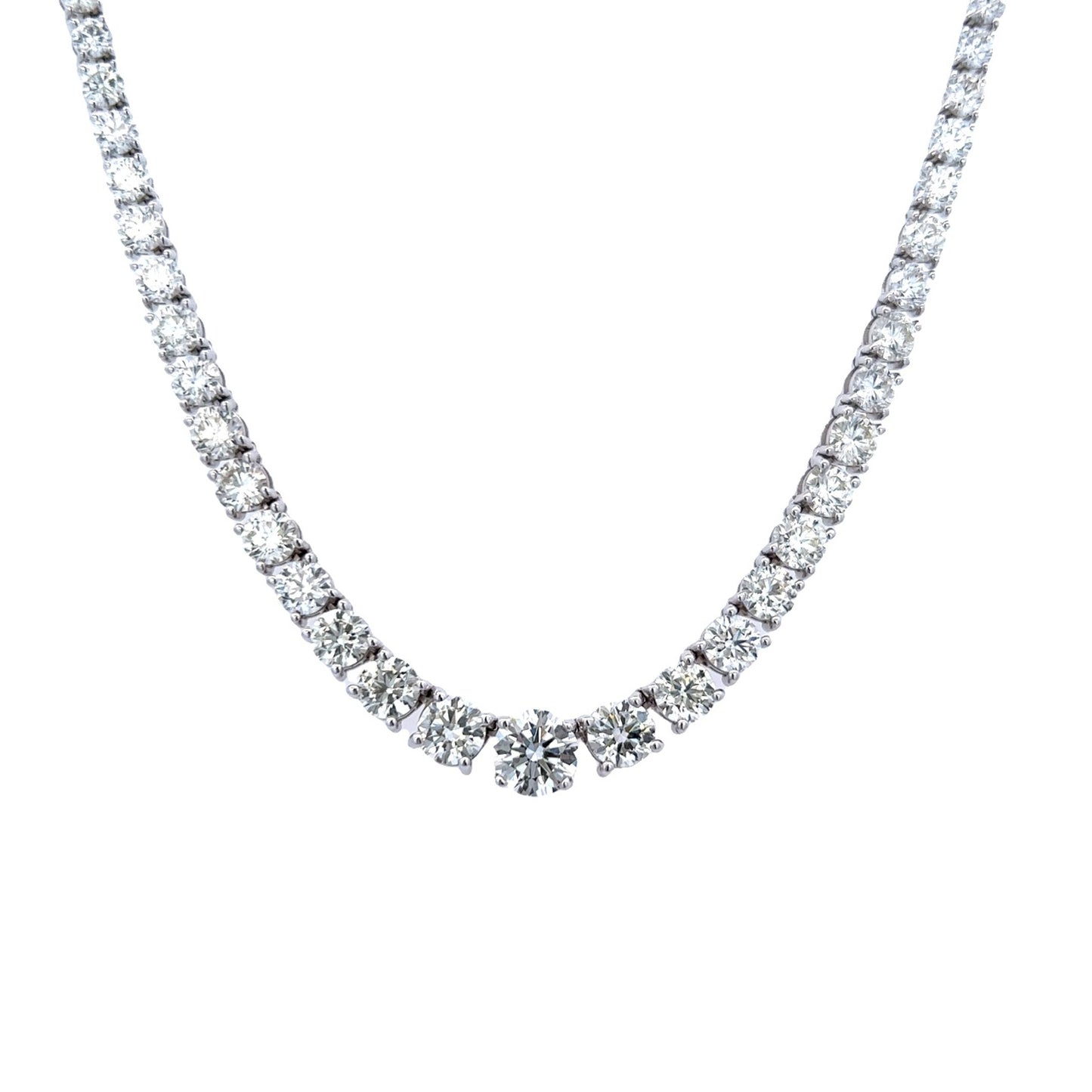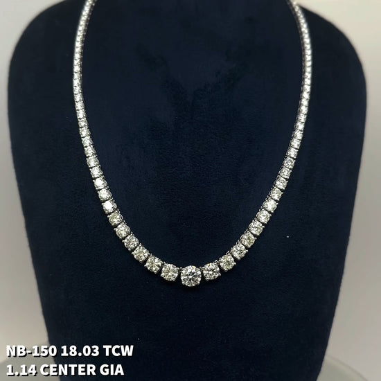 This 18.03 Cts. Natural Round Riviera Necklace boasts a unique combination of elegance and sophistication with its 18K white gold construction and a stunning round-cut center diamond. It is the perfect piece to elevate any look. Get ready to make a statement with this luxurious necklace.