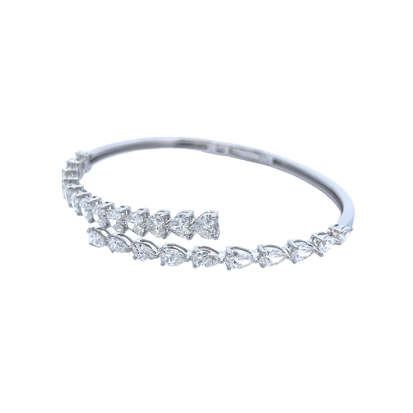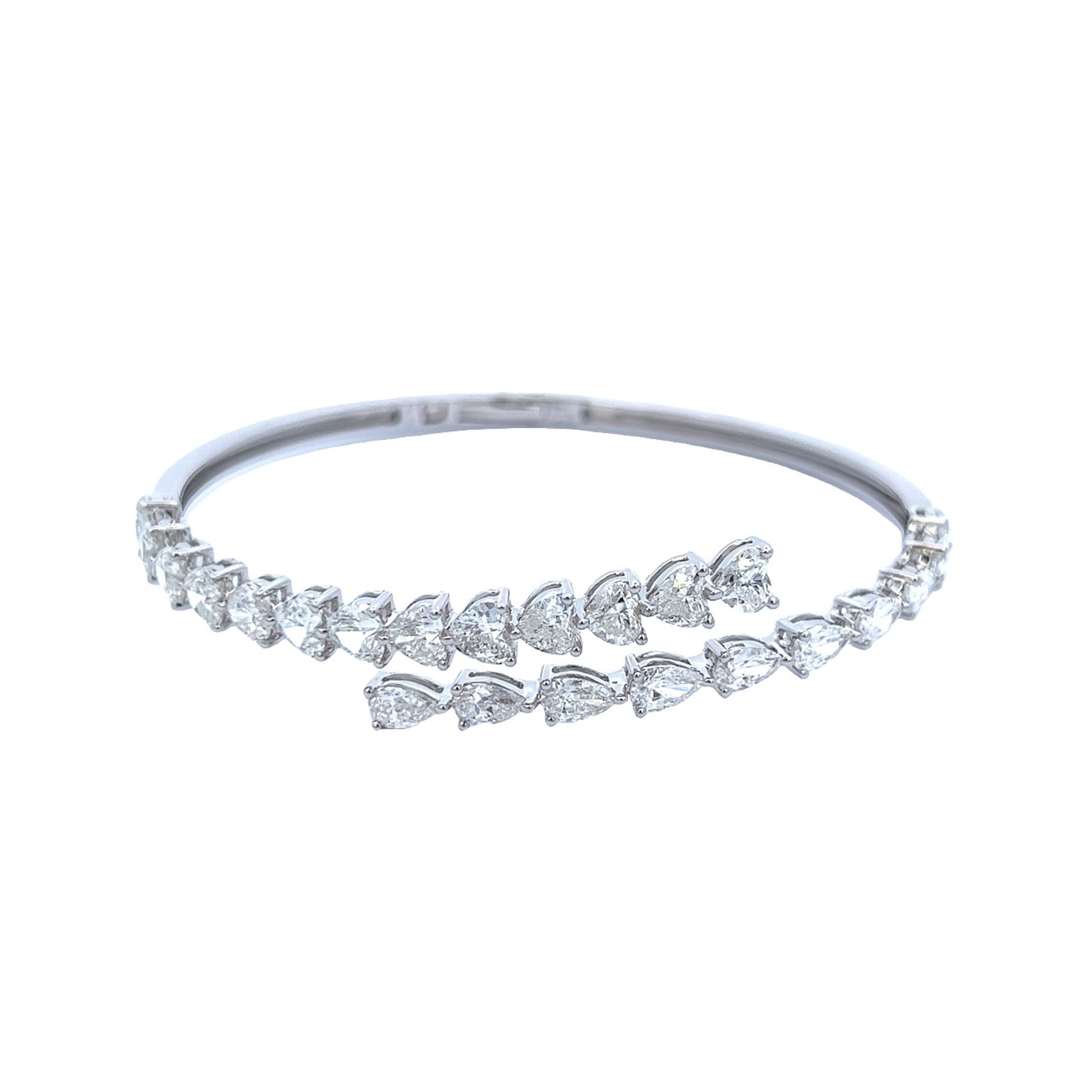 This 18K white gold bangle features a beautiful overlap of heart and pear-shaped diamonds that add up to 6.40 TCW. Its timeless design is ideal for any special occasion.