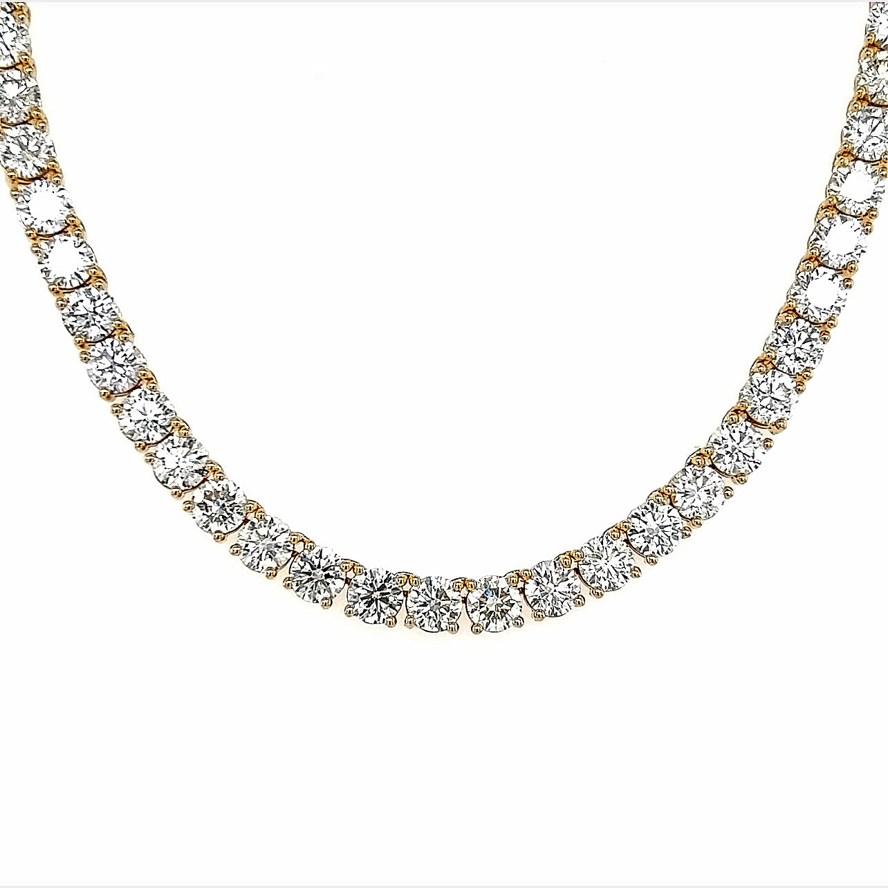 This exquisite 18K yellow gold eternity necklace is set with 34.84 total carats of round diamonds for a dazzling effect. The 4 prong set diamonds are set in a continuous circle for a timeless and classic look. This luxurious necklace will make the perfect addition to any collection.