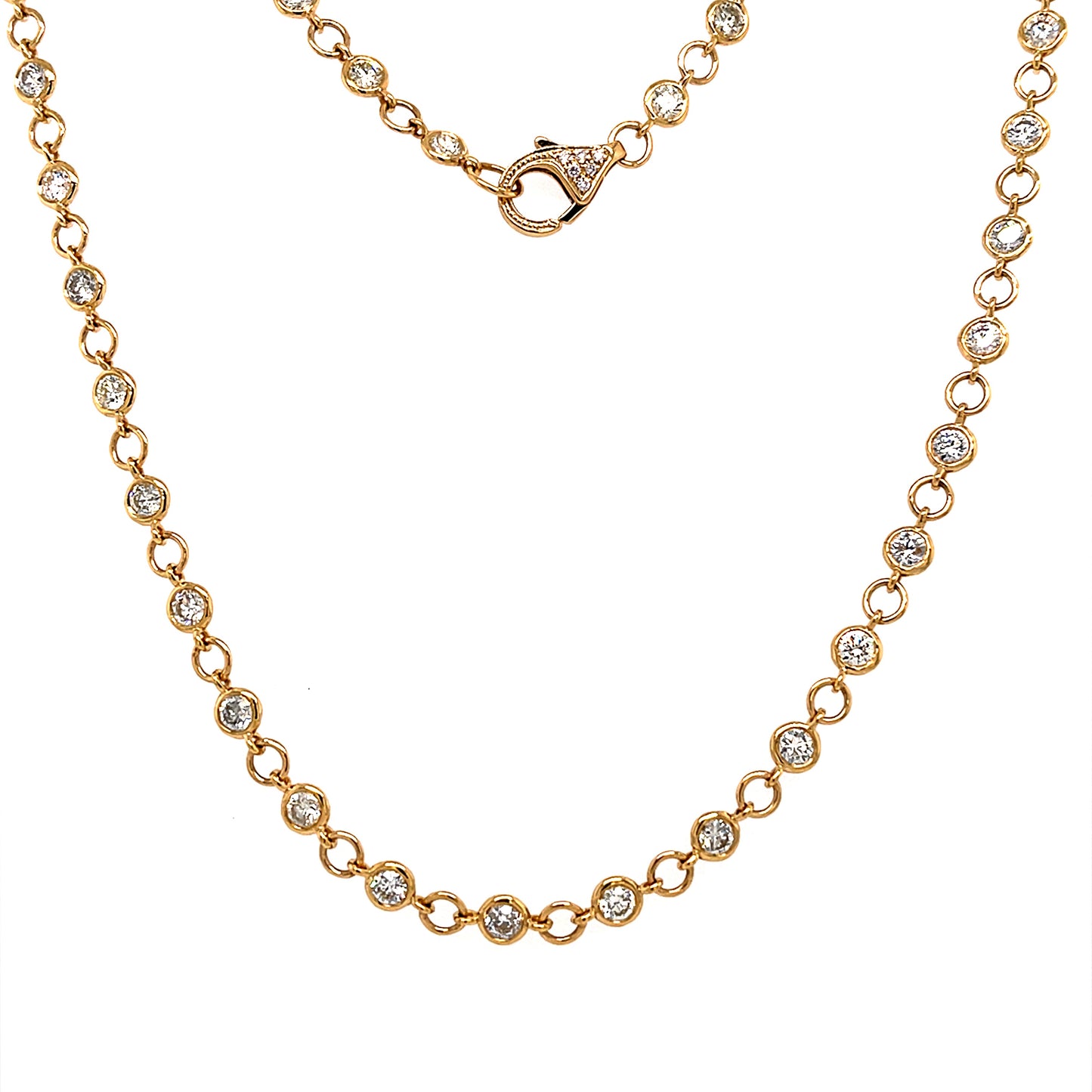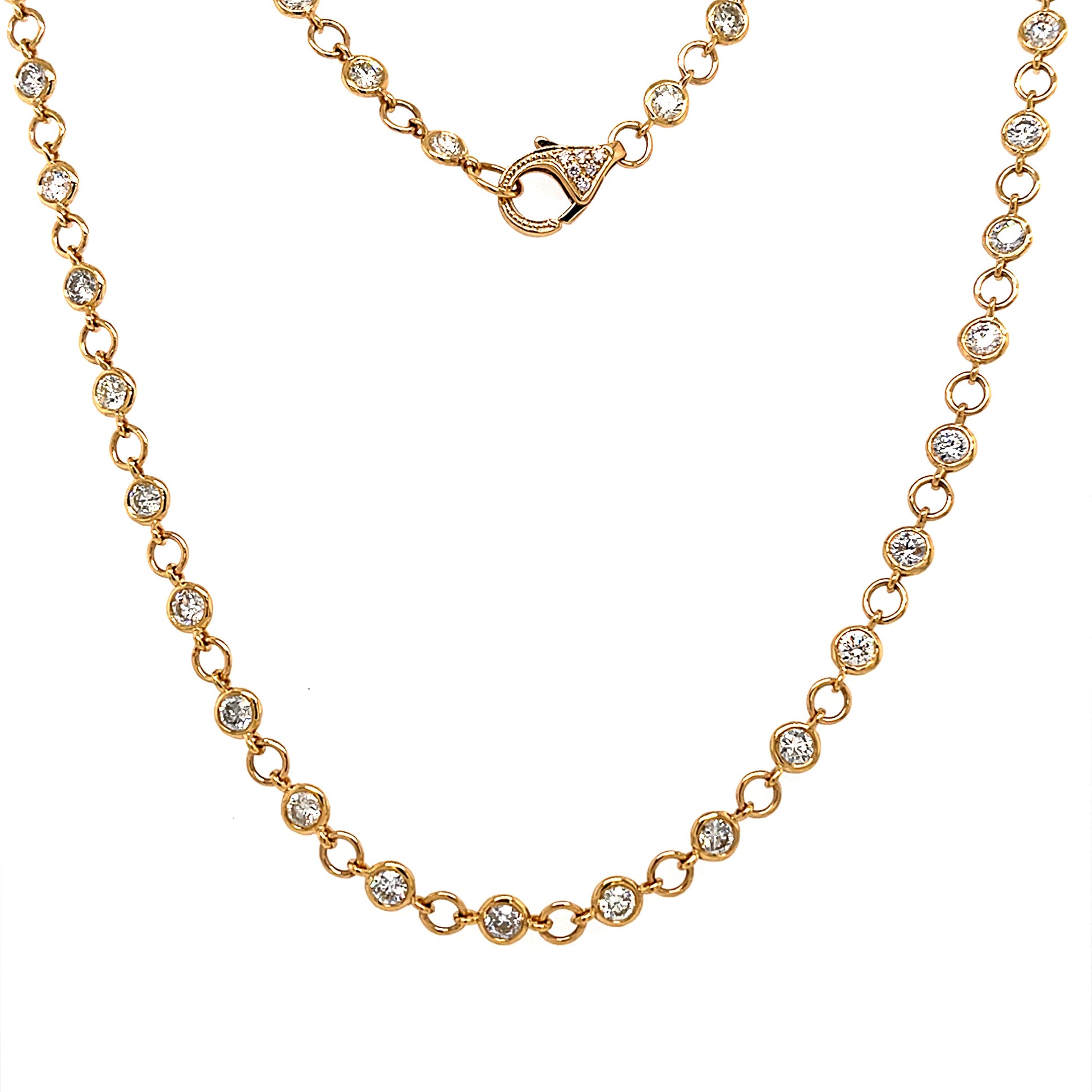 This beautiful 18K Yellow Gold necklace features 4.33 Carats of Round Brilliant Diamonds set By-The-Yard. Enjoy the luxury of a timeless classic providing a sparkle that lasts forever.
