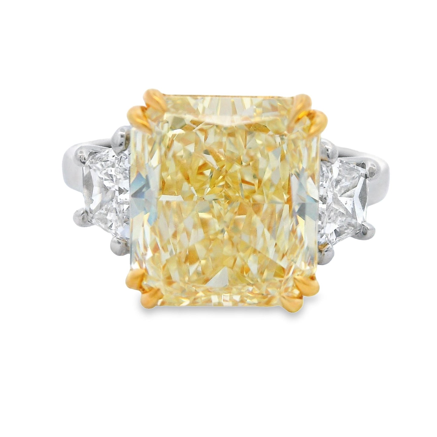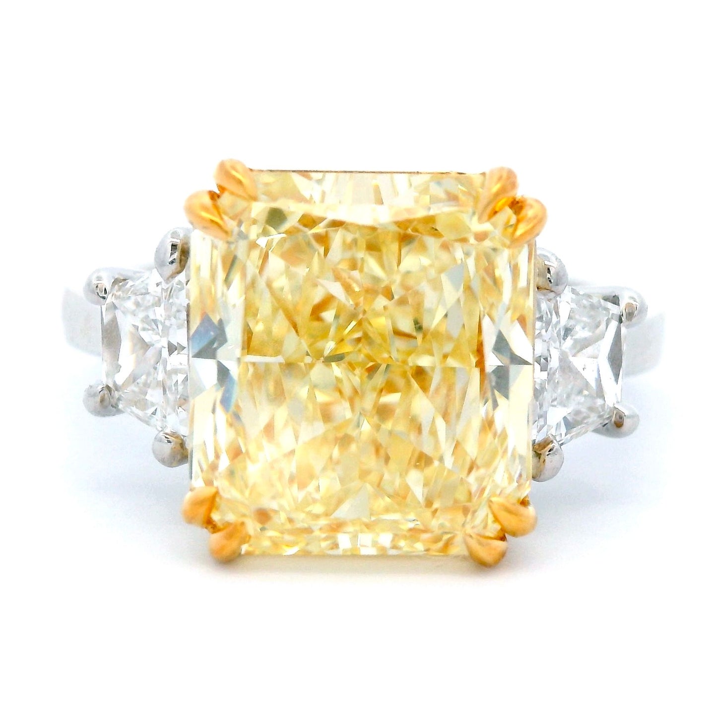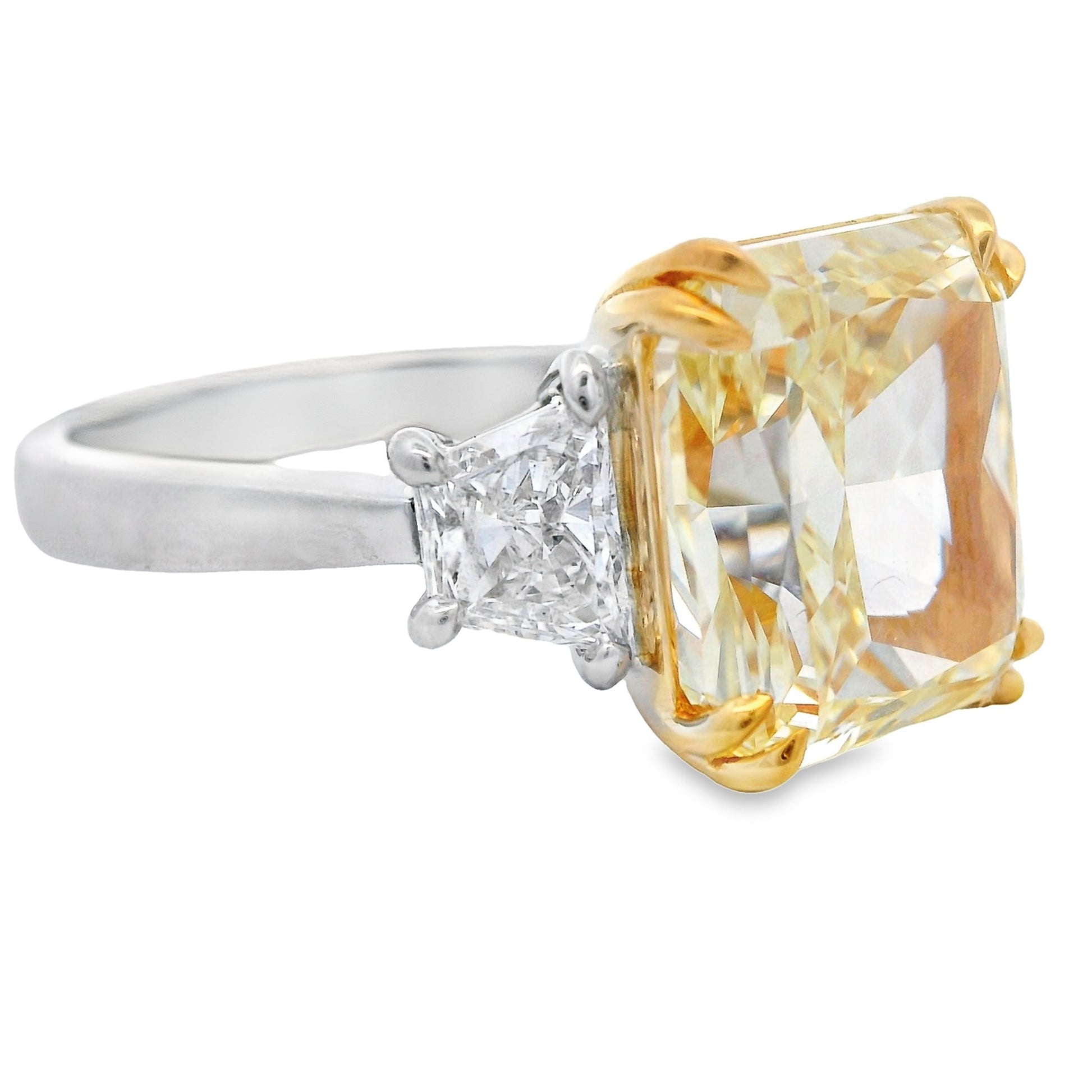 Enhance your style with our 5.24 Natural Radiant Fancy Yellow Diamond Ring GIA. Crafted with trapezoids on the sides, this ring radiates elegance and sophistication. Make a statement with its rare natural 5.24 carat diamond, certified by GIA. A timeless addition to your jewelry collection.