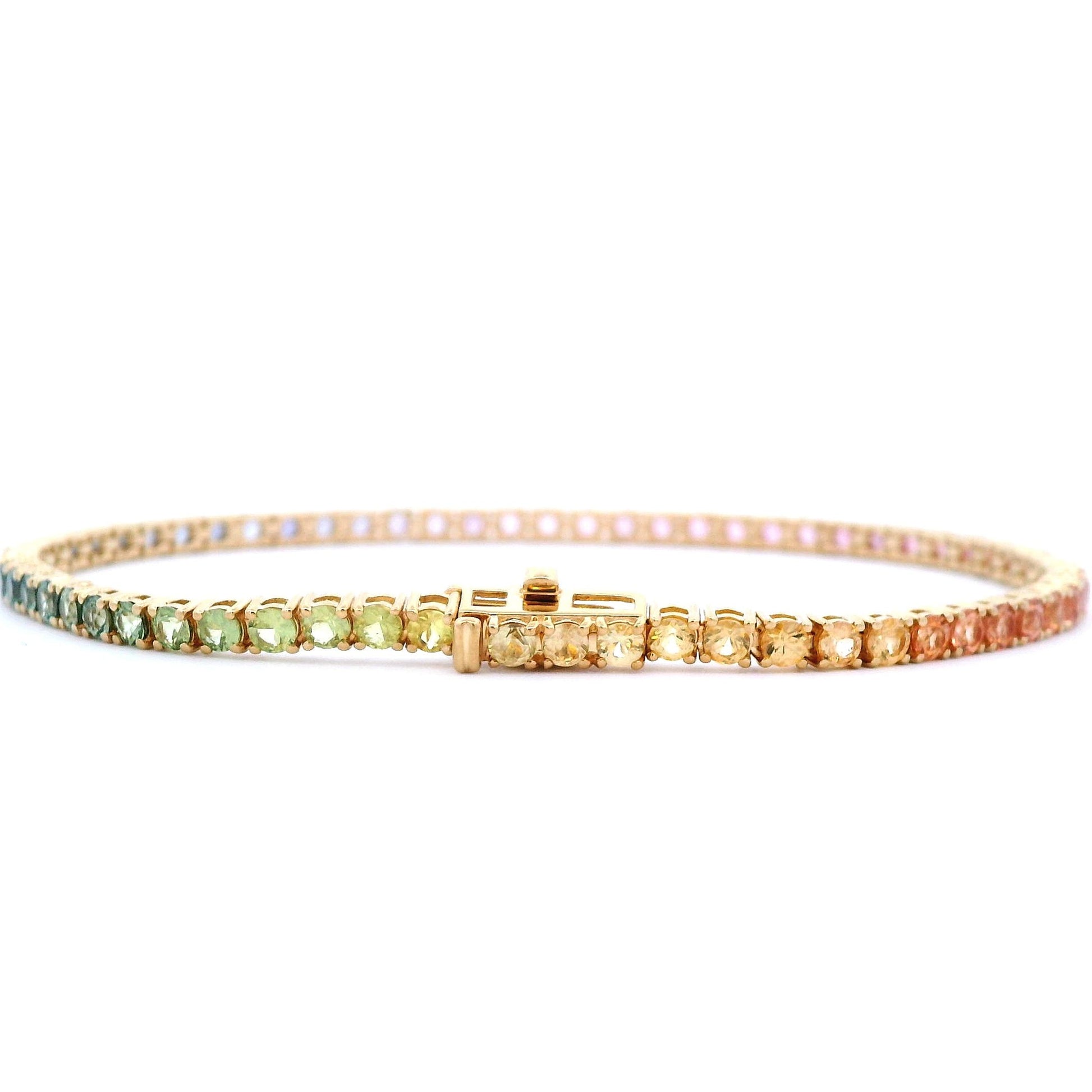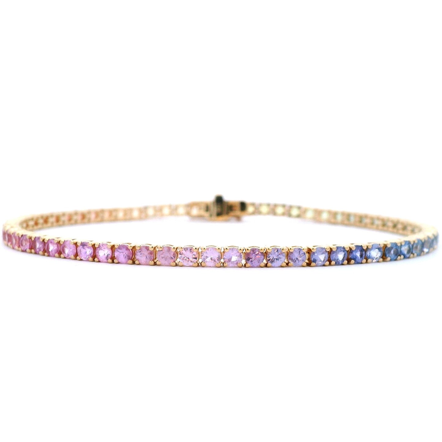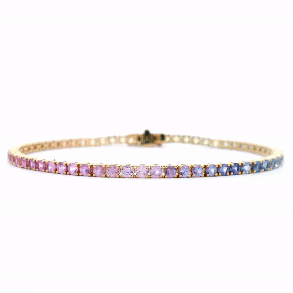 Indulge in the poetic beauty of this exquisite 5.31 Cts. Pastel Rainbow Sapphire Tennis Bracelet. With a dreamy palette of pastel sapphires, this premium piece exudes elegance and grace. Perfect for adding a touch of luxury to any outfit, this bracelet is a must-have for any jewelry collection.