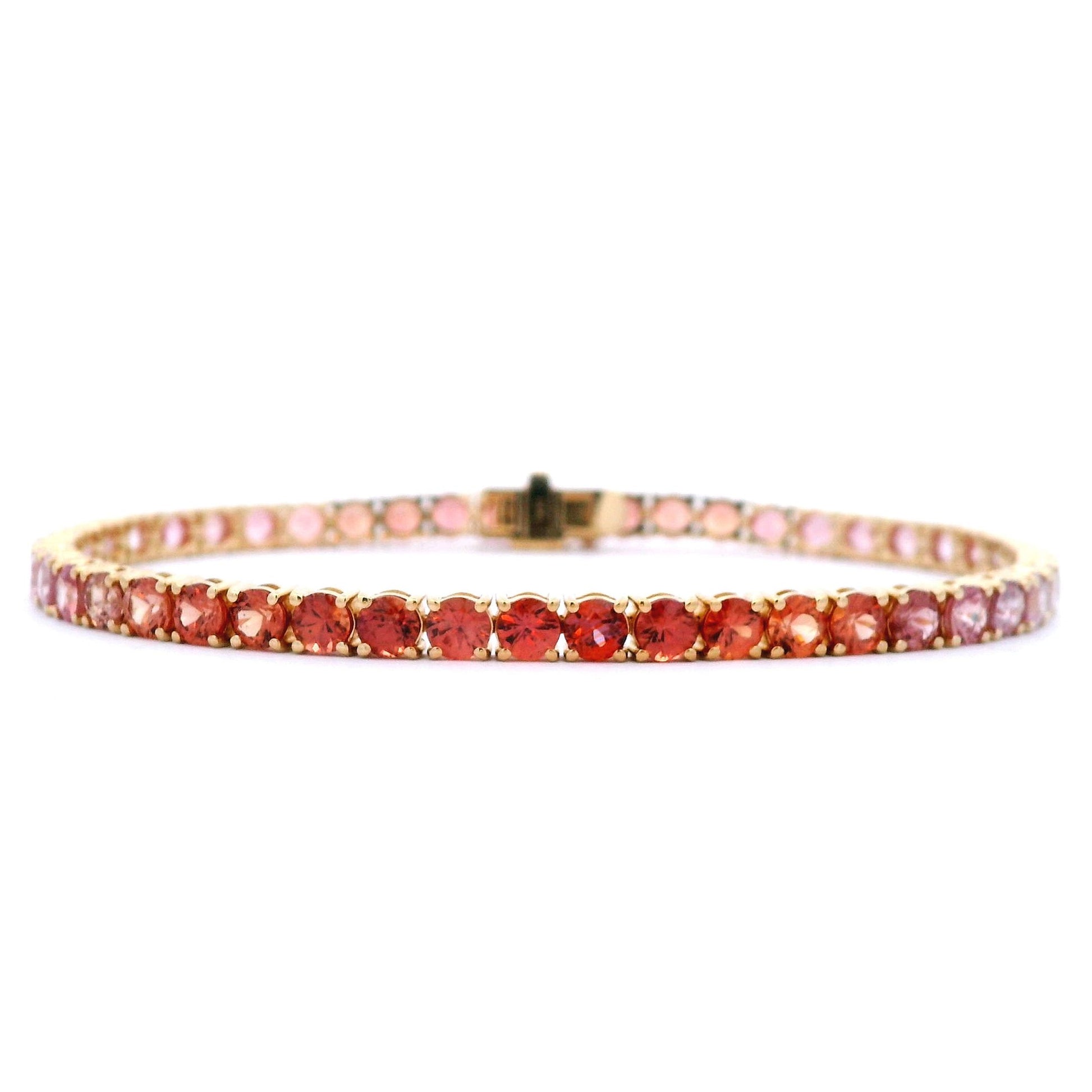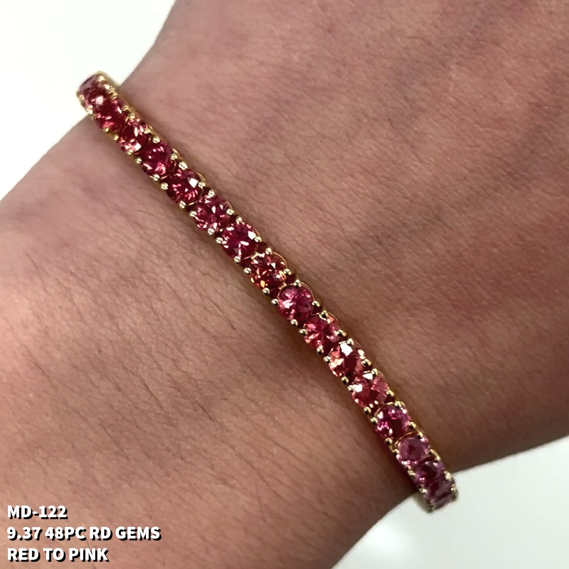Elevate your style with our exquisite 9.37 Cts. Pink to Red Sapphire & Ruby Tennis Bracelet. Crafted with precision, this bracelet features stunning gemstones that range from vibrant pink to deep red, offering a unique and luxurious touch to any outfit. Make a statement and indulge in luxury with this exclusive piece.